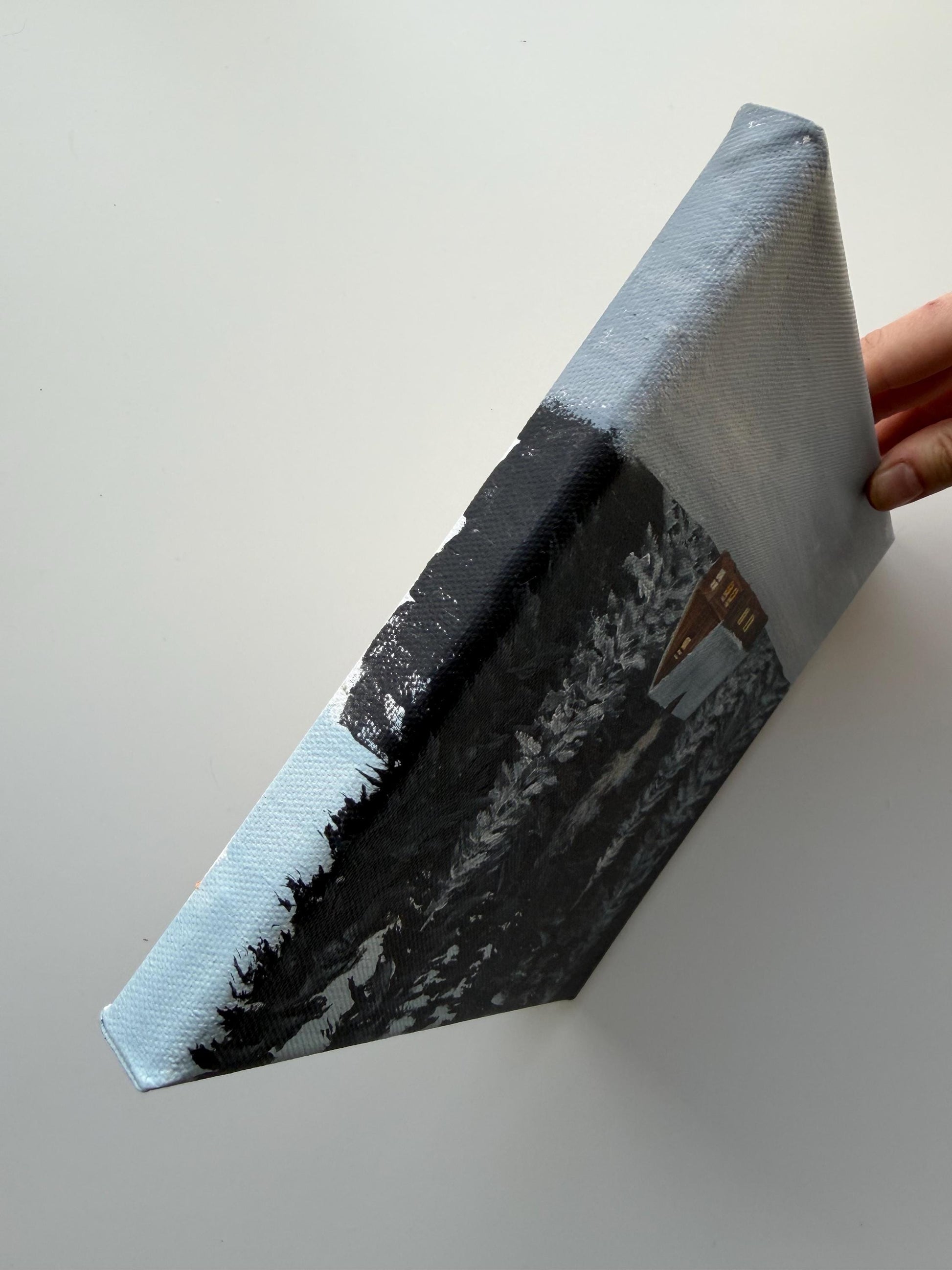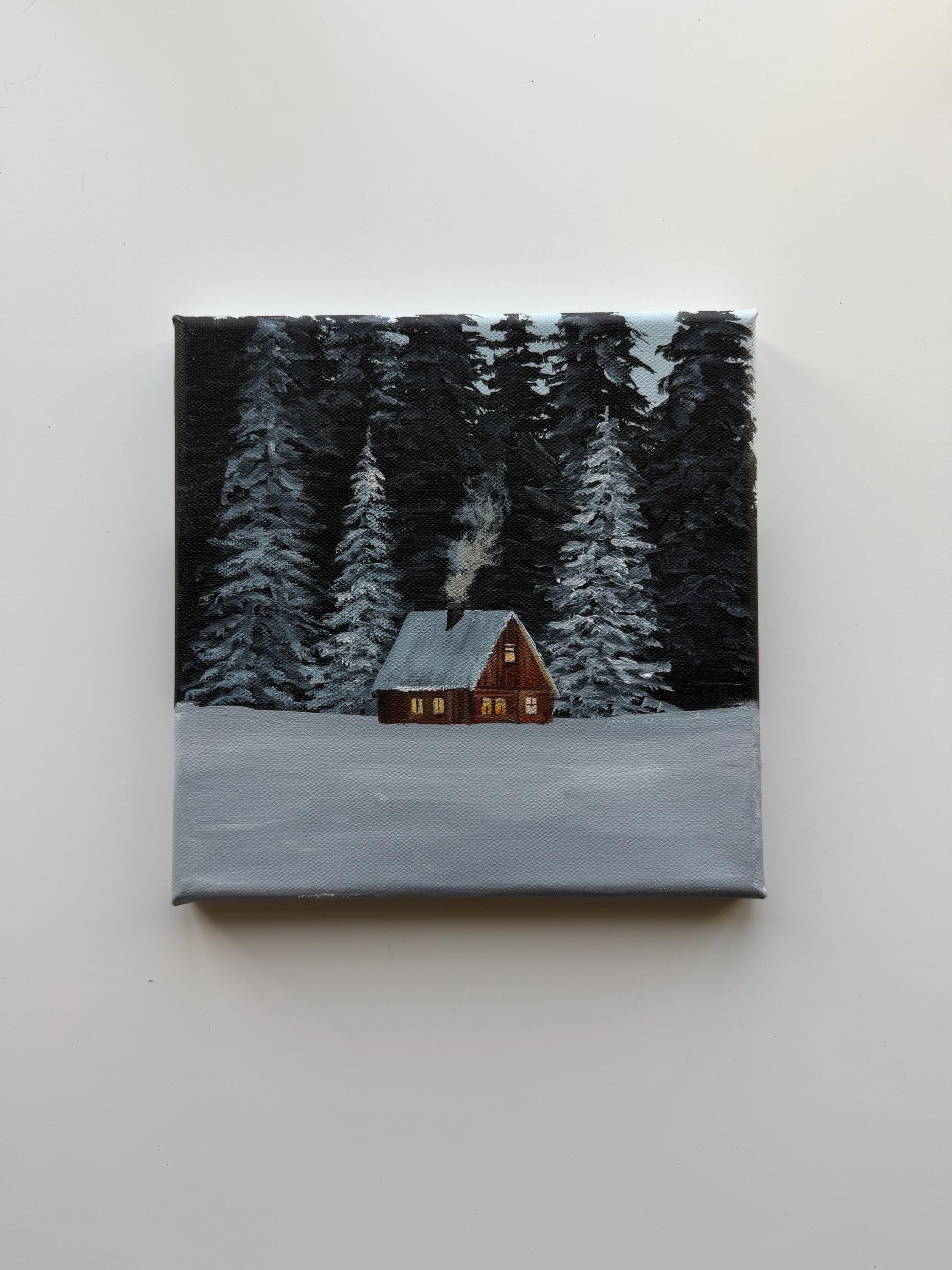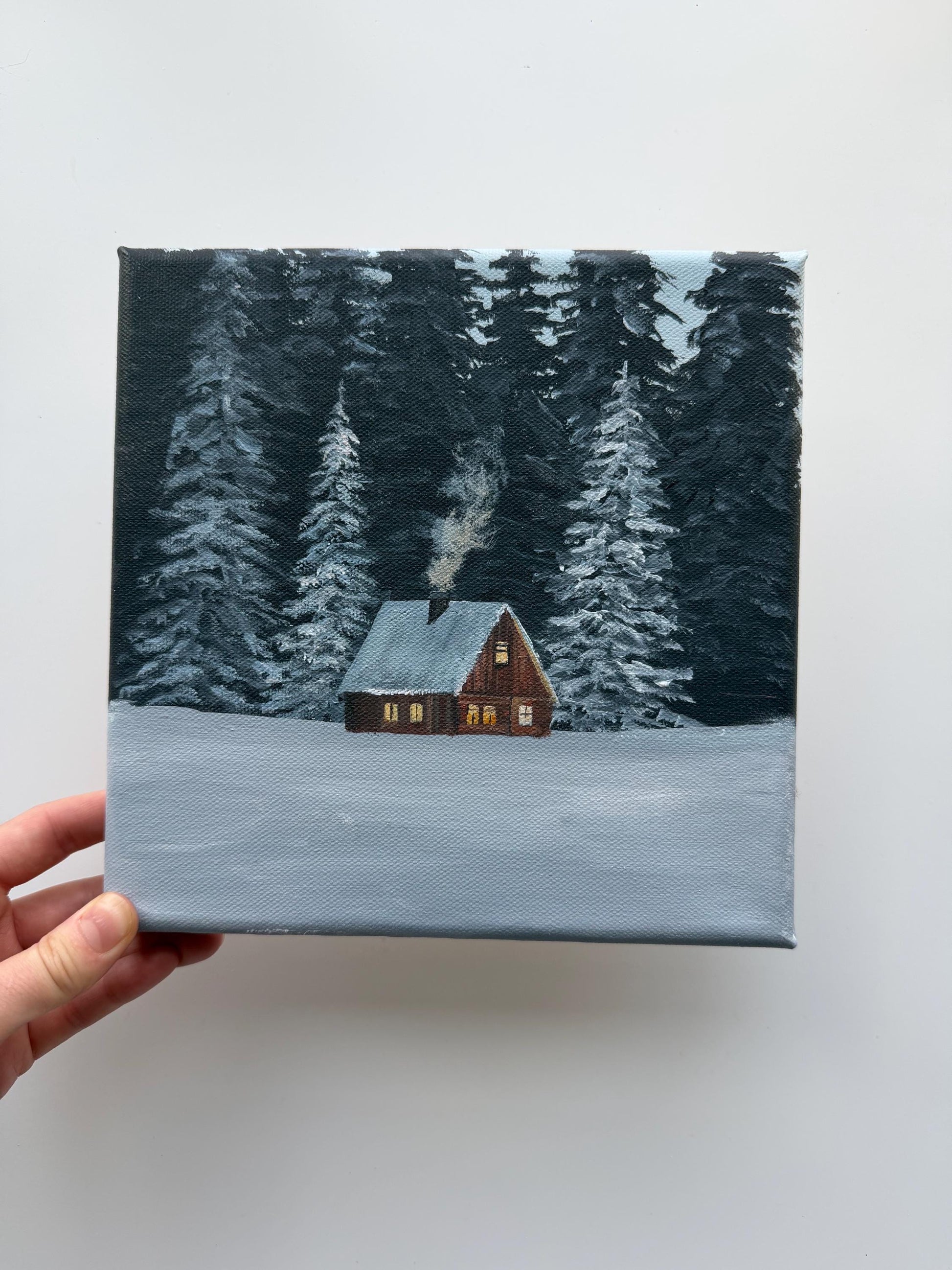 This original 8x8 winter cabin painting features a small glowing cabin surrounded by snowy trees and a peaceful forest setting. It has a cozy, quiet feel that makes it a beautiful piece for winter decor, cabin decor, or anyone who loves serene woodland scenes.