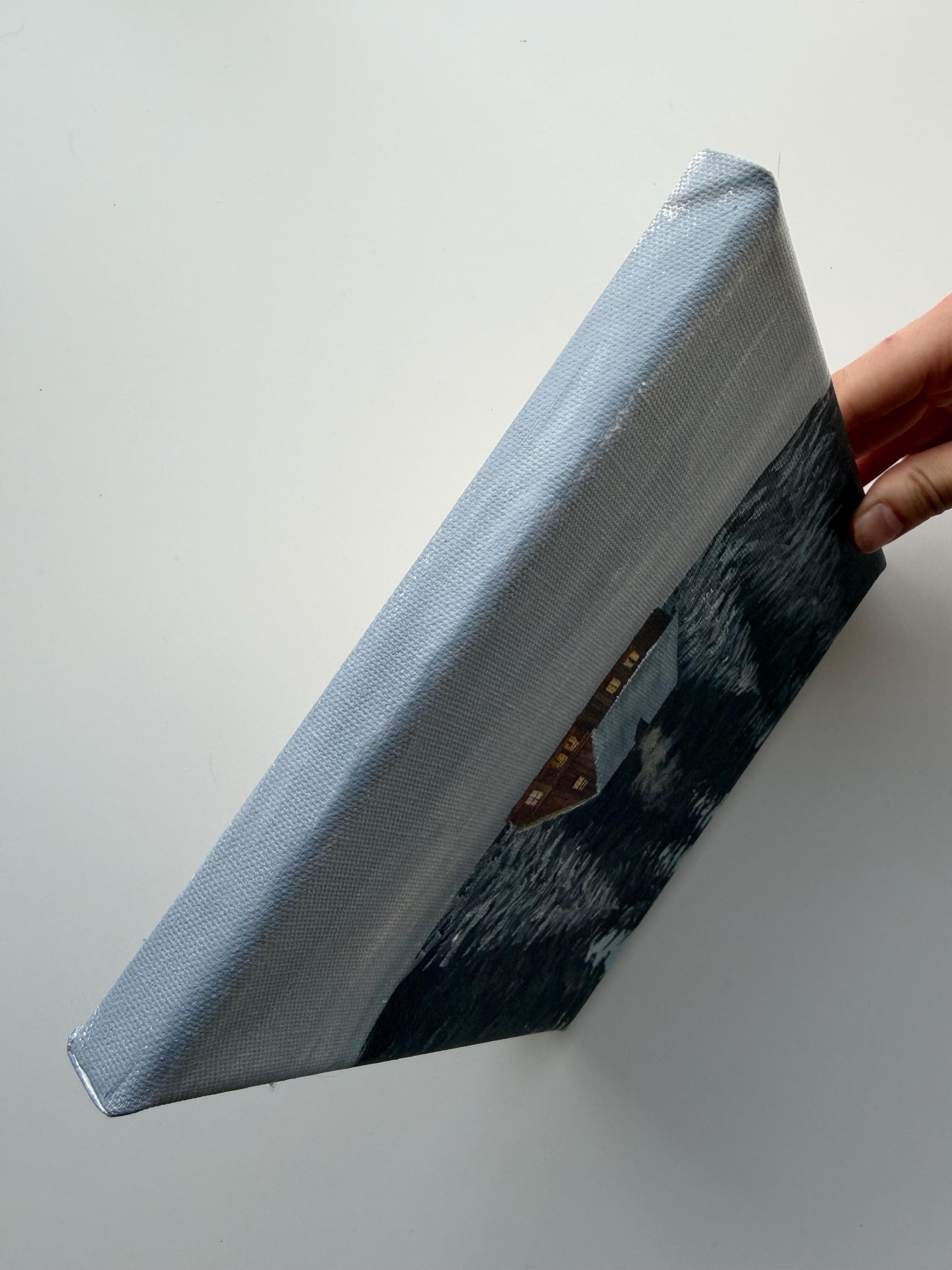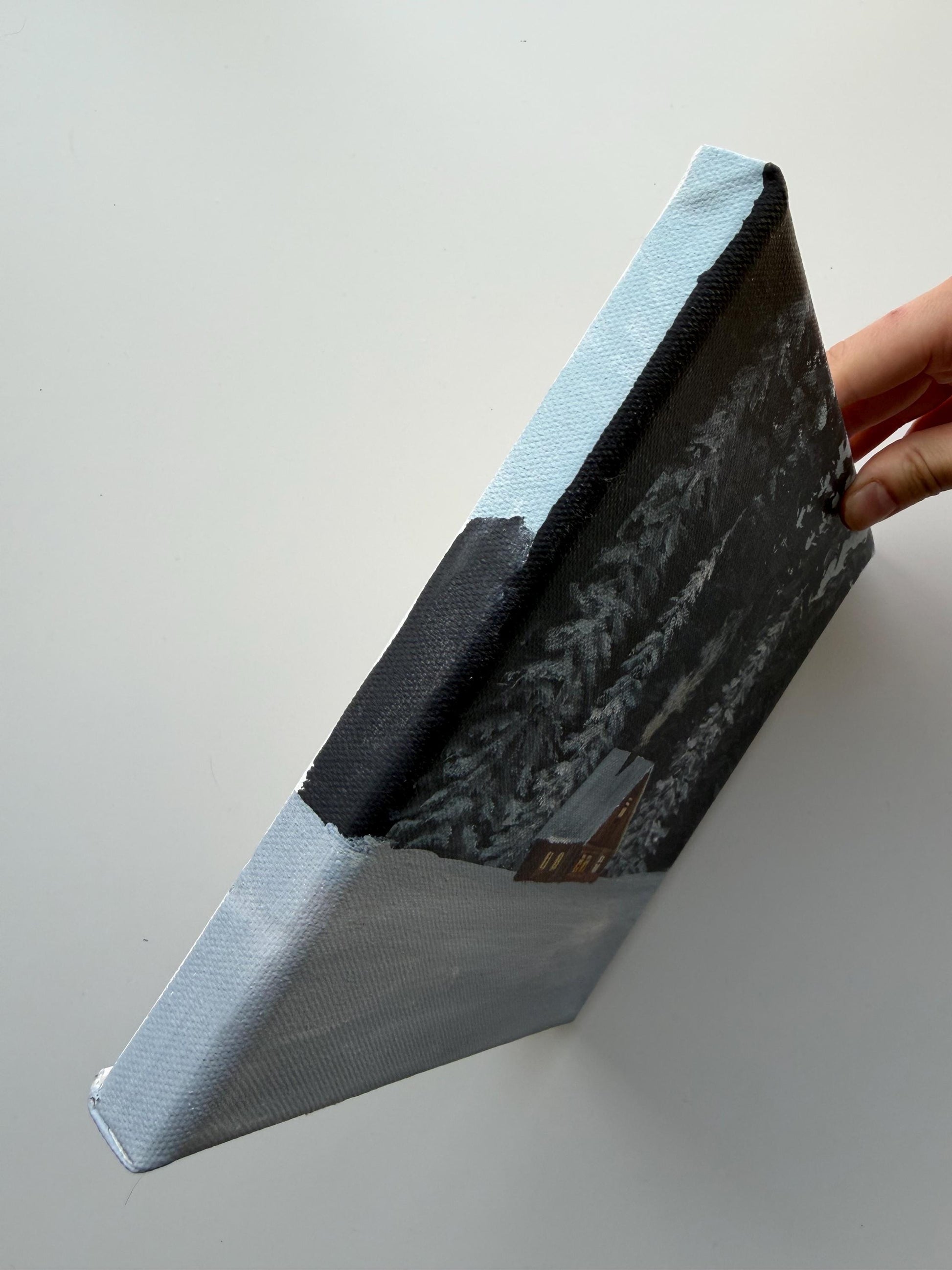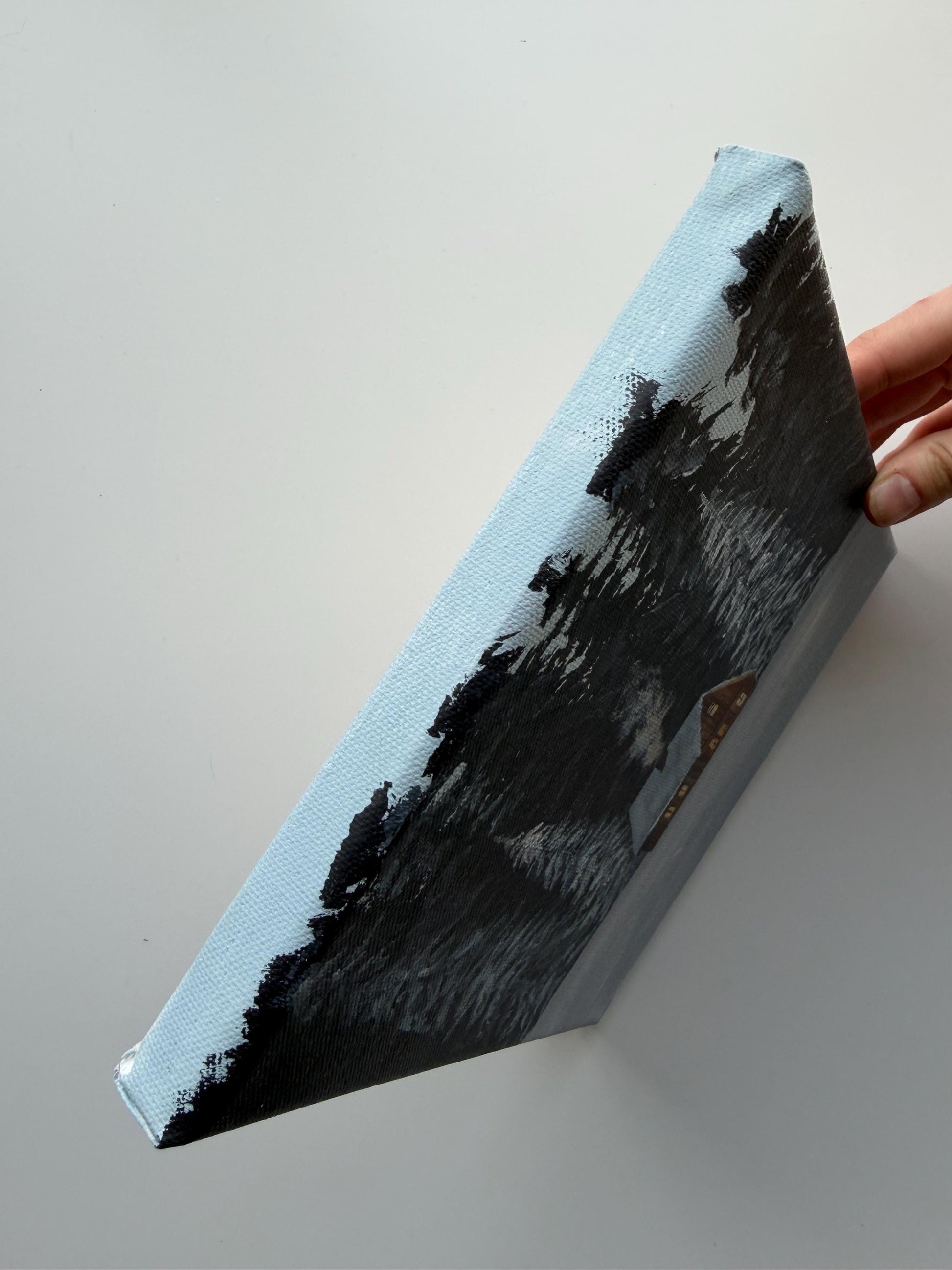 This original 8x8 winter cabin painting features a small glowing cabin surrounded by snowy trees and a peaceful forest setting. It has a cozy, quiet feel that makes it a beautiful piece for winter decor, cabin decor, or anyone who loves serene woodland scenes.