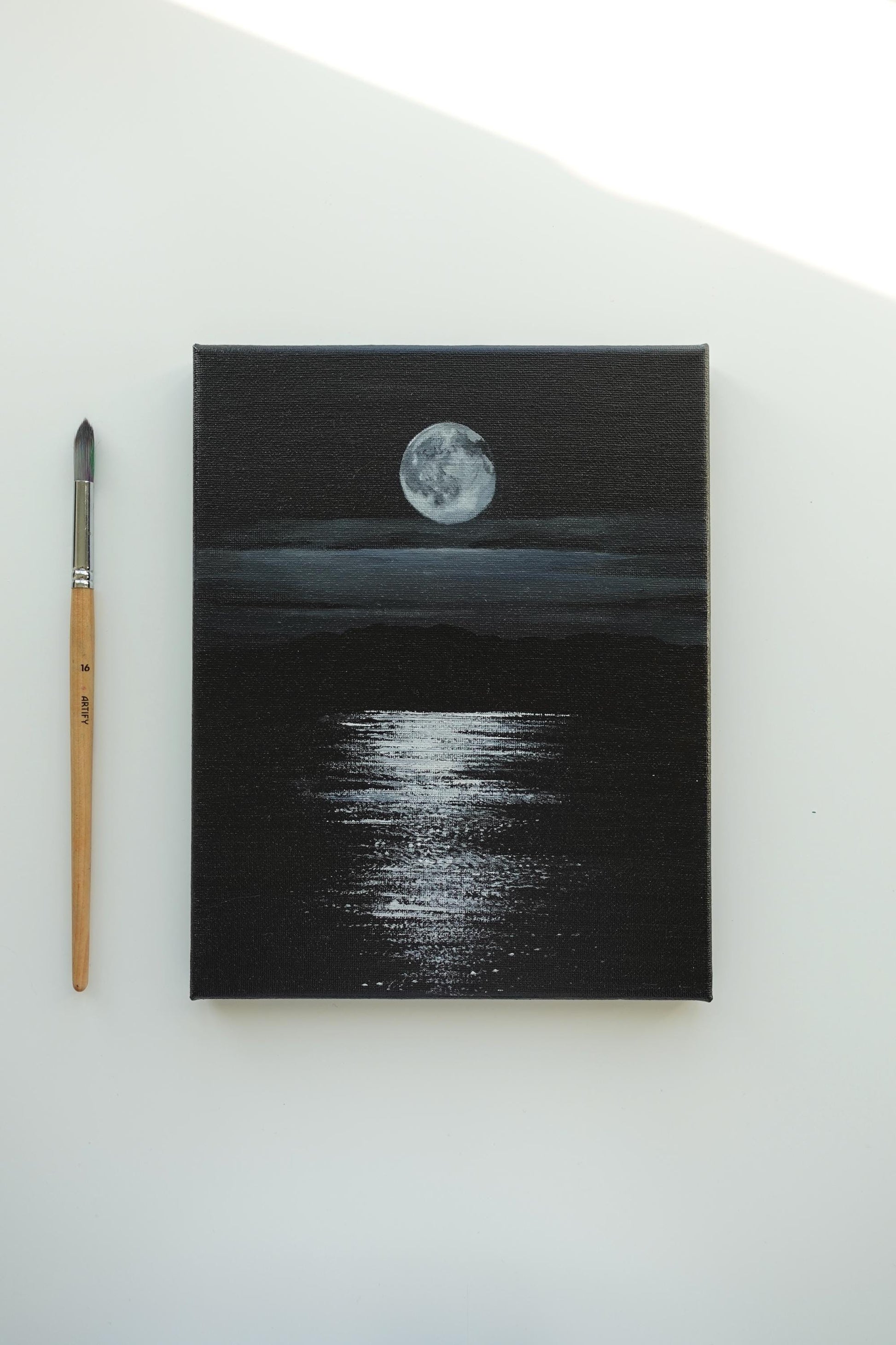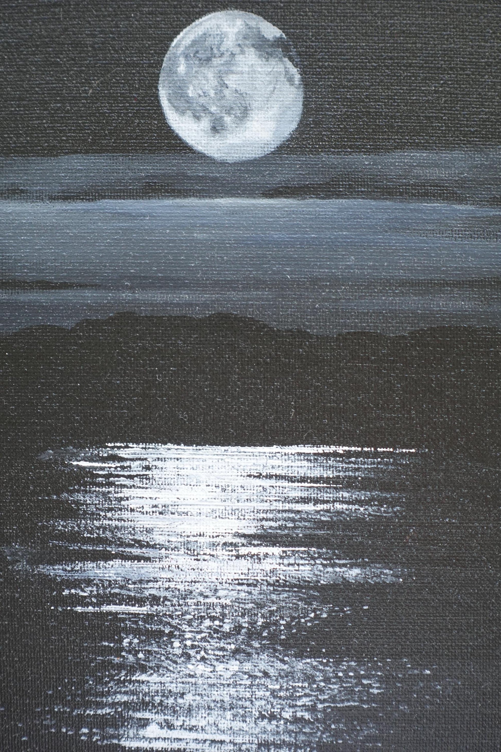 Immerse yourself in the serenity of the night with "Moonlit Reflection," an original 8" x 10" acrylic painting. This monochrome nightscape captures the ethereal beauty of the full moon reflecting over calm waters, creating a peaceful and dreamy atmosphere.