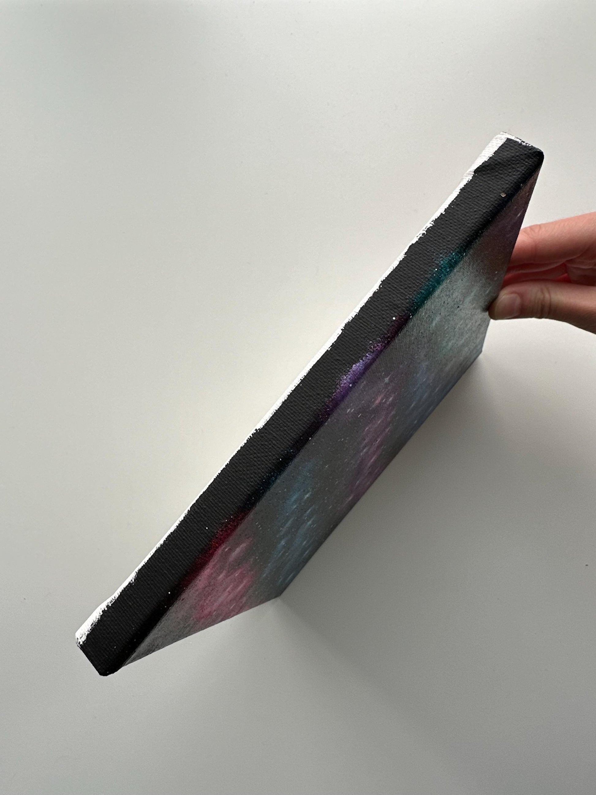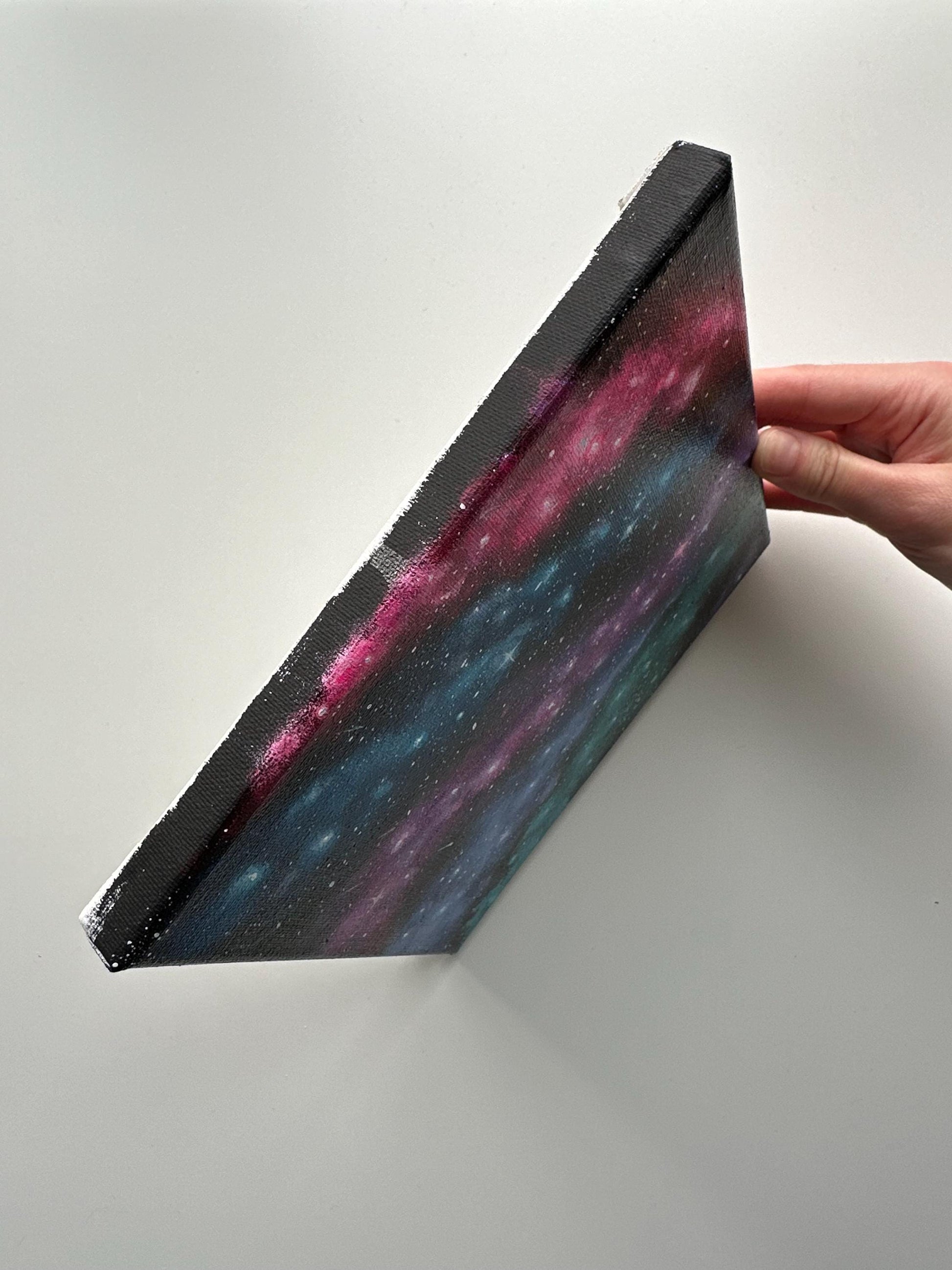 Step into the cosmos with "Galactic Veil," an original 8" x 8" acrylic painting featuring mesmerizing swirls of blue, pink, and purple nebulae against a star-filled night sky. Perfect for anyone who loves celestial art and the beauty of the universe.